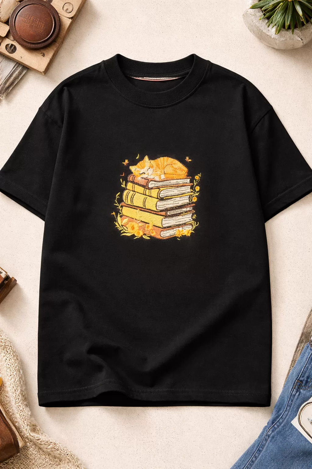 এই Dark Ash Drop-Shoulder T-Shirt-এ রয়েছে একটি হাই-কোয়ালিটি এমব্রয়ডারি ডিজাইন, যেখানে বইয়ের স্তূপের ওপর ঘুমন্ত বিড়াল—একদম নিখুঁত ও ডিটেইলড ফিনিশিং সহ।