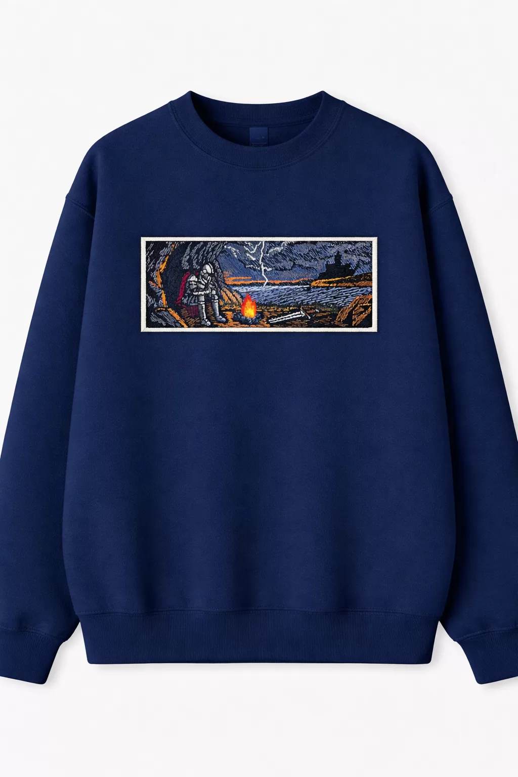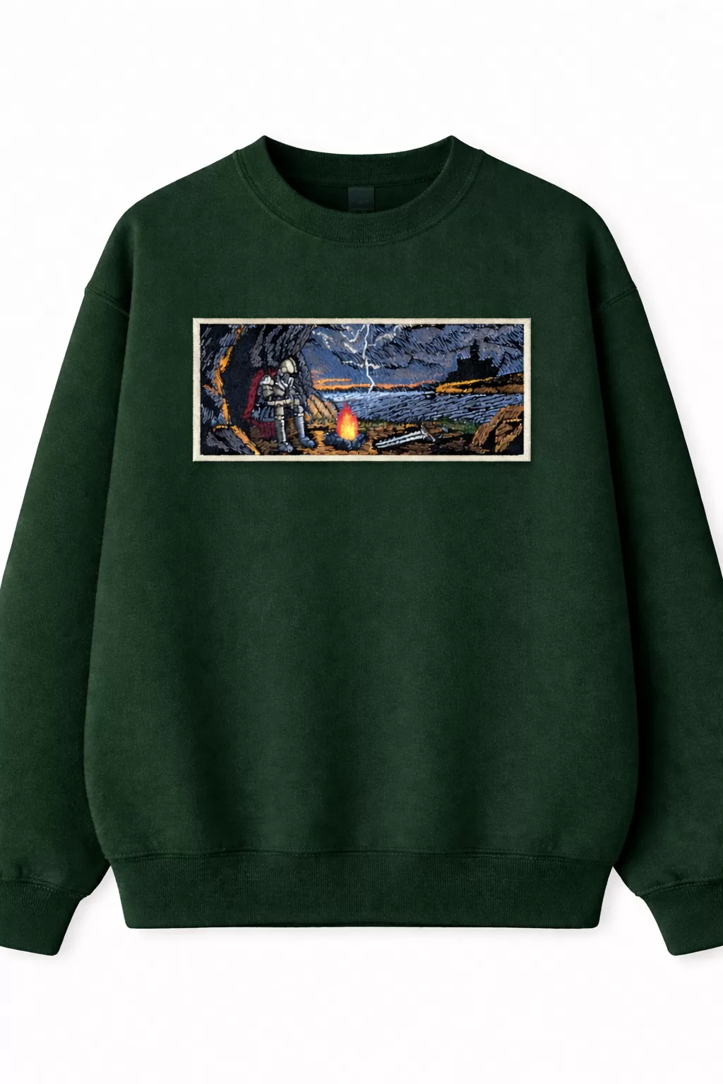 Embroidery in dark fantasy style: a weary knight rests by the fire, its flames tearing through the darkness and casting reflections on the heavy armor. In the distance loom the shadows of a ruined world — harsh cliffs, a grim sky, and rumbling thunder. In this silence there is both calm and the foreboding of a new battle — as if the night itself is holding its breath, awaiting the outcome of the eternal struggle between light and darkness.